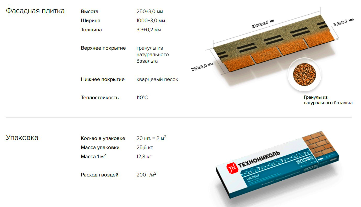 ОПИСАНИЕ ПРОДУКТА: Фасадная плитка ТЕХНОНИКОЛЬ HAUBERK – это штучный битумосодержащий однослойный материал для облицовки фасадов строения. Созданная на основе стеклохолста, улучшенного битума и гранулята из натурального базальта, фасадная плитка отличается повышенной герметичностью, устойчивостью к коррозии и колебаниям температур, а также обладает исключительной долговечностью материала и цвета. Простоту монтажа гарантирует усиленный клеевой замок на каждой фасадной плитке.