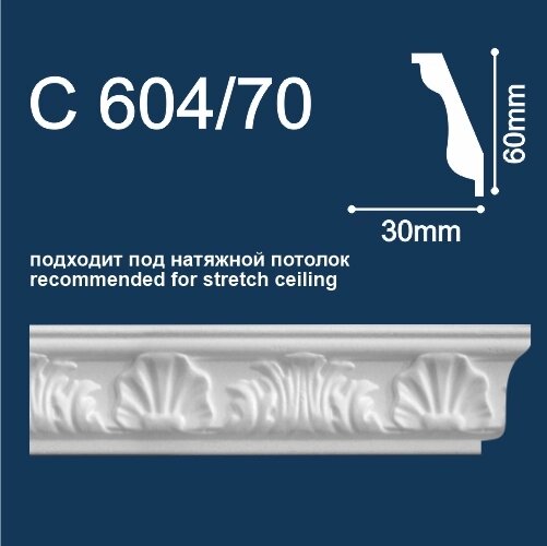Плинтус потолочный инжекционный С604/70 предназначен для отделки стен и потолка. Выполняет декоративную функцию. Скрывает шов между потолком и стеной. Материал отличается легкостью, прочностью и долговечностью. Прост в монтаже.